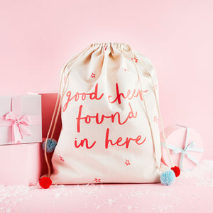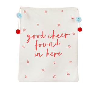 A cute bag full of Christmas joy! Fill this sack up with lots of exciting presents for the kids to unwrap! This canvas sack features ‘Good Cheer Found in Here’ across the front with stars and cute pomp poms. It will certainly bring a smile to your little ones face and they discover all the gifts inside!