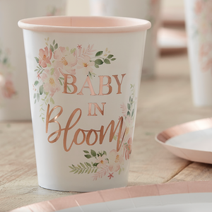 Celebrate your baby shower with these stylish Rose Gold Foiled 'Baby in Bloom' Floral Cups. These elegant cups will make the perfect setting for the glowing Mommy-to-be. Set the beautiful floral rose gold foiled cups amongst the matching 'Baby in Bloom' Plates and Napkins for a stylish table setting.