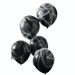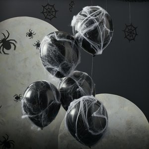 Pack contains 5 latex balloons. Balloons measure 12". Includes 1m white webbing to wrap around the balloons, 15 plastic spiders and 40 glue dots.