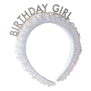 Help the birthday girl stand out on her special day with this pearl birthday headband. This party headband looks great with any outfit, and features gorgeous pearl detailing with gold sparkled 'birthday girl' topper.