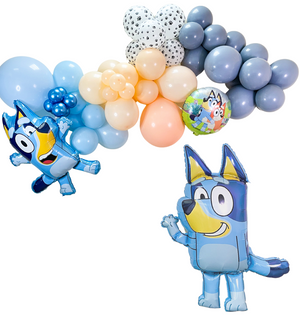 Cute Bluey themed balloon decor, the 46" blue walker foil balloon paired with matching blue ombre latex balloon garland with paw printed latex balloons for a Wackadoo One or Two Bluey party!