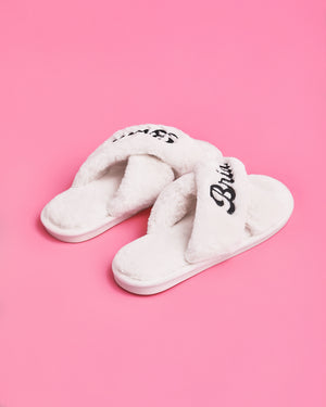 Keep it classy-cozy. Soft white faux fur, but make it bridal. Not to be dramatic but these are actually the comfiest slippers ever. You'll grab them for your bach trip and never take them off again.