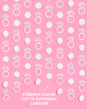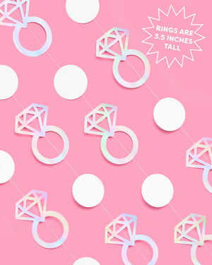 The Era of All Eras. Because nothing says engaged like iridescent rings and a whole lotta white. This engagement ring garland features shimmering foil rings and white iridescent circles, pre-assembled and ready to party.