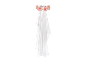 Add a beautiful sweet floral style to your locks with this earthy Flower Crown with Veil. A thin braided brand is adorned with a mix of flowers. The bow ribbons enhance the boho look. This Flower Crown would be perfect for a festival hen or a hen at home.