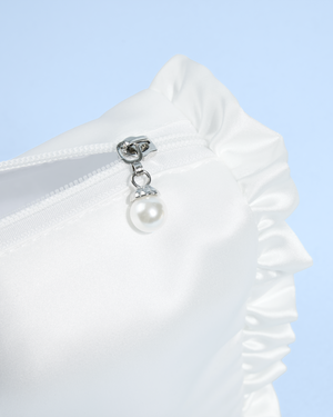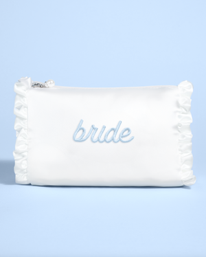 A not-so-basic, basic. This white satin beauty bag features ruffled edges, pearl zipper detailing, and “bride” embroidered in soft blue, because even your touch-up kit deserves to look cute. Perfect for keeping your glow-up essentials close while you slay the pre-wedding scene.