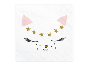 Set the table with these precious Kitty Cat Party Napkins! These cute cat face napkins with gold detail on one side and pink on the opposite side with the word MEOW. Use these napkins to wipe up milk spills from your little kittens.