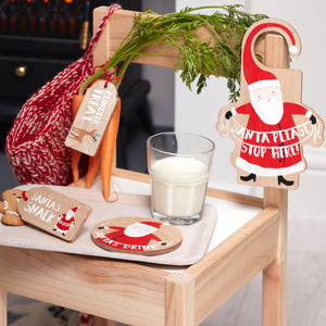 Kit includes: 1x 'Santa Please Stop Here' door sign, 1x 'Santa's Snack' tag, 1x 'Reindeer Snack' tag, 1x 'Santa's Drink' coaster. Each components measures: Door sign- 13.5cm (W) x 22cm (H), Snack Tags - 4.8cm (W) x 10cm (H), Coaster: 11cm (W) x 11cm (H). Each 0.5cm (D).