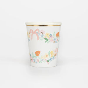 The elegant combination of watercolor flowers, strawberries and on-trend bows on these party cups is perfect for garden parties, bridal showers or any celebration where you want a refined effect.