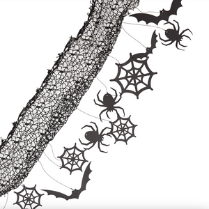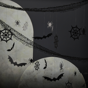 Create a spine-chilling atmosphere at your Halloween party with this Halloween Backdrop with Hanging Spiders, Bats and Cobwebs. This bunting will be sure to give your guests the creeps! Perfect to hang across walls or even furniture - it's the ultimate Halloween decoration!