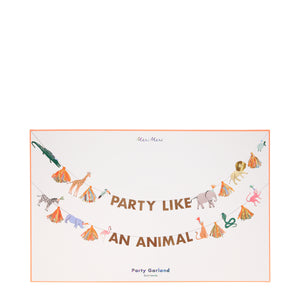 This Large Safari Animals Garland by Meri Meri is a fabulous combination of a fun message, "Party Like An Animal" in striking gold foil letters, with twelve wild animal pennants and eight striking tassels. Beautifully illustrated and crafted, and pre-strung on two lengths of blue bakers twine. It'll look absolutely amazing in the party room.