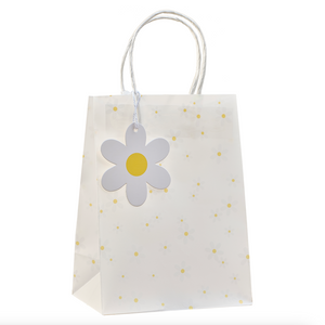 • x5 vellum paper bags with daisy print, measuring 20cm (H) x 15cm (W) with white raffia handles