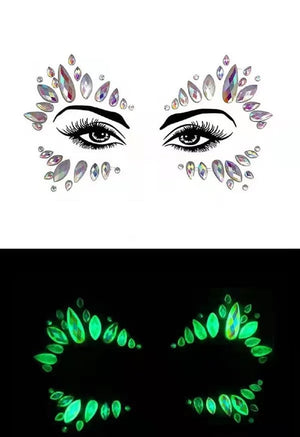 Light up the night with these Glow in the Dark Face Gems. The ultimate accessory for parties, concerts and bachelorette celebrations! Made from quality, skin-safe rhinestones and acrylic gems, these luminous jewels add an unforgettable sparkle to any look.