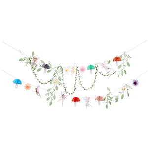 Decorate your little fairy's birthday party with this Fairy Garland Set by Meri Meri! These two party banners feature fairies with iridescent threads in their skirts, flowers with sweet tissue paper tassels, and leaves with a honeycomb detail for a 3D effect. Hang this garland over doorways, along tabletops, or on walls for a picture-perfect photo backdrop at your little girl's fairy birthday party or fairy baby shower!