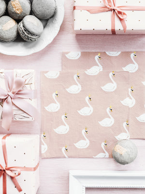 These pretty blush party napkins are covered in Lovely Swans, each one wearing a crown for a girly birthday. They are perfect for table decorations.