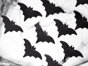 Decorate your creepy Halloween party with the Black Bat Party Napkins! These small napkins are shaped like a bat and feature gold metallic eyelashes. Keep a stack of these Halloween napkins on the table at your Halloween party so guests can grab one with their favorite beverage and keep their hands clean!