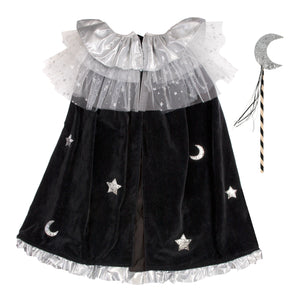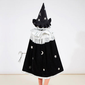Transform into a witch with this elegantly creepy Velvet Witch Cape & Wand Costume by Meri Meri. It includes a cape and a satin wand crafted from velvet, tulle and silver lame with silver glitter star and moon details. A fabulous outfit to wear for Halloween, or whenever you fancy casting spells in style!