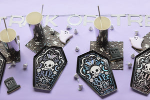 The coolest coffin in the graveyard! Featuring holographic silver foil-pressed elements, these Halloween Doomsday Napkins are to die for!