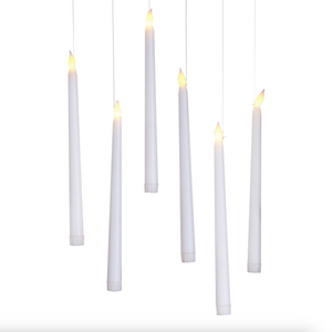 Each set contains x6 White LED dinner candles, 27cm (L). Clear plastic twine. Batteries not included.