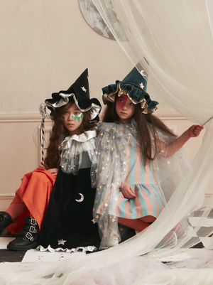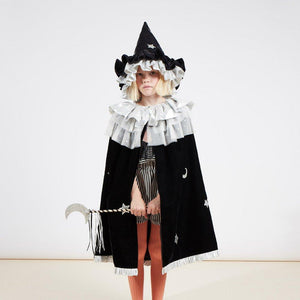 This witch's hat by Meri Meri, with ruffle details, is very stylish indeed. It is crafted from soft black velvet, with silver lamé and silver glitter stars and moons. An essential accessory for Halloween, or to add to a dressing up box for imaginative play any time of the year.