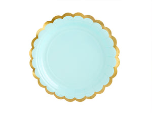 Give your table an adorable look with these Mint Gold-Trimmed Scalloped Dessert Plates! The plates have metallic gold trim, perfect for adding a subtle shine to your tableware. These scalloped mint paper plates make a great foundation for the snack table or dessert buffet.