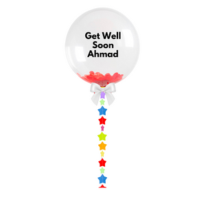 Add the wow factor to your celebrations with our Colored Stars and Custom Text Bubble Balloon. This customized balloon is filled with Red confetti and sits on a handmade Colored Stars tail! meaning you won't find it anywhere else!