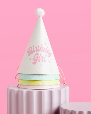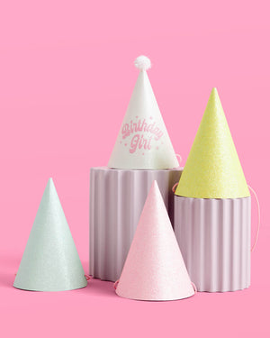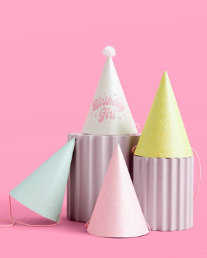Did someone say soft girl summer? These pastel party hats are a must for the prettiest picnics and celebrations. This set brings all the dreamy, soft-girl vibes to your celebration. Featuring glitter paper hats in blue, yellow, and pink, plus a special pom-pom hat for the Birthday Girl—because she deserves the spotlight.