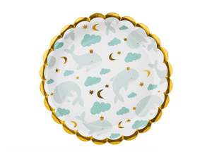 Guests will have a whale of a dessert at your baby shower with these Blue Baby Whale Dessert Plates! These small plates feature baby blue whales wearing gold foil crowns, blue clouds, and gold foil moons and stars on a white background with a scalloped gold foil edge. Place these baby shower plates on the dessert table so guests can enjoy cake or small treats. Use these whale plates with other baby shower party decorations for a whale baby shower or your little squirt's whale first birthday.