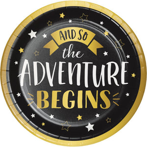 Invite everyone over to celebrate the graduate with the help from these Grad Adventure Paper Plates. These premium-strength plates feature a black, white, and metallic gold look. They feature stars and "And so the adventure begins" inscription.