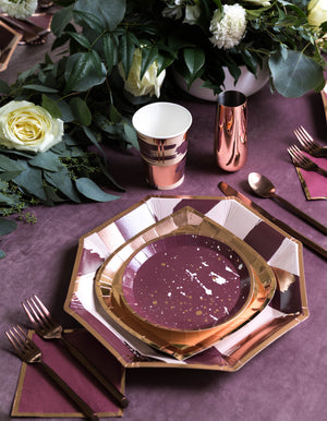Beautiful and versatile, the Mauve-Elous collection is created to bring stylish one-time use party goods to the most elegant of occasions. Inspired by the beauty that is created in art, the collection features a mix of brushstroke and paint splatter elements with a two tone mauve color palate and rose gold finishes.