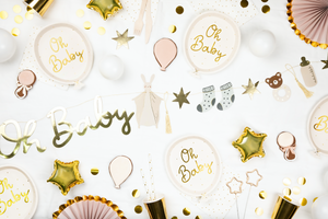 Welcome the sweet arrival with these Oh Baby Balloon Shaped Plates! These paper plates resemble a cream balloon with a gold "Oh Baby" headline and small polka dots in gold foil. Set these paper plates on your food table or place one at each place setting so guests can enjoy cake and sweet treats. But don't worry—these plates won't reveal the surprise too soon at your gender reveal. Add baby shower plates to your table for your baby shower and mix in blue, pink, or any gender-neutral decoration.