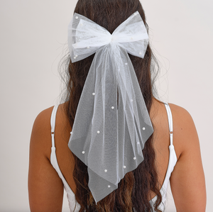 Make the bride feel extra special at her hen with this sweet pearl bow. This tulle bow hair accessory with pearls is the perfect subtle touch for the bride-to-be at her hen party.