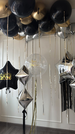 Transform your space with a ceiling full of balloons for an instant festive impact. This curated ceiling balloon set is perfect for New Year’s Eve, birthdays, celebrations, and statement party setups. Each balloon comes finished with elegant black bows and shimmering tinsel strings, creating a polished look from above.