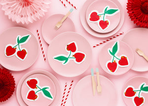 Add a fruity touch to your party with these Cherries Beverage Napkins. These small die-cut napkins are shaped like red cherries with metallic gold foil detail and green stems. Keep a stack of these cute napkins on hand at your shower or party.