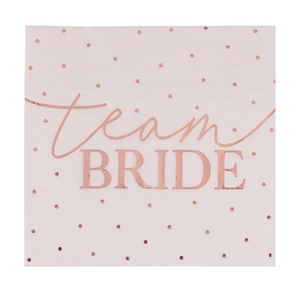 These Team Bride Blush pink and rose gold polka dot foiled napkins are perfect for delicious nibbles. Make sure to place them around the party so guests can enjoy treats. A perfect finishing touch!