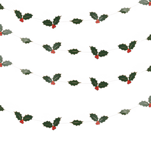 This festive and vibrant Holly Leaves Christmas Garland will be a great finishing touch to your decorations. The traditional colors of green and red add a splash of color from the holly and berries and the gold foil detail will shimmer under the lights.