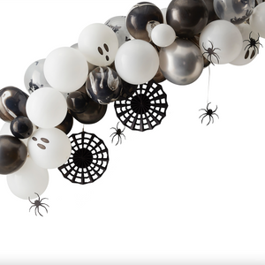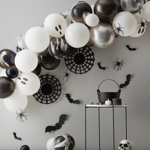 With ghost balloons, confetti bat balloons, dangling spiders and spiderwebs this balloon garland contains all the characters to create a spooky entrance to your Halloween Party! The monochrome design will suit any Halloween theme. Use this arch to create a ghostly centerpiece or freaky photo backdrop for your spooky selfies.