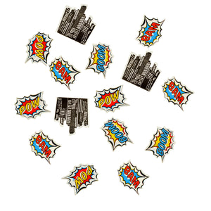 This cool pop art superhero table confetti comes with different designs. Each small piece of confetti is printed on both sides and has a mix of the following words and mini buildings in a pack, BOOM, BAM, POW.