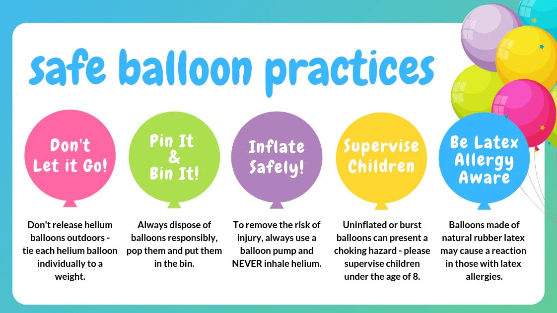 We kindly urge you to dispose of all waste responsibly and recycle where possible. Please avoid balloon releases under any circumstances. Helium-filled balloons should never be released outdoors, always ensure balloons are disposed of safely.