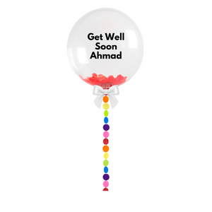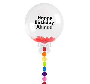 Add the wow factor to your celebrations with our Rainbow and Custom Text Bubble Balloon. This customized balloon is filled with Red confetti and sits on a handmade Rainbow circles tail! meaning you won't find it anywhere else!