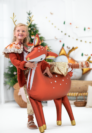 Everyone will have a fawn time at your woodland party when you decorate with this matte Giant Woodland Deer Balloon! This balloon is shaped like a white-tailed deer with small gold antlers and hooves. Use in your photo booth backdrop at your party. You can pair this party balloon with other forest animal balloons to create a balloon bouquet.